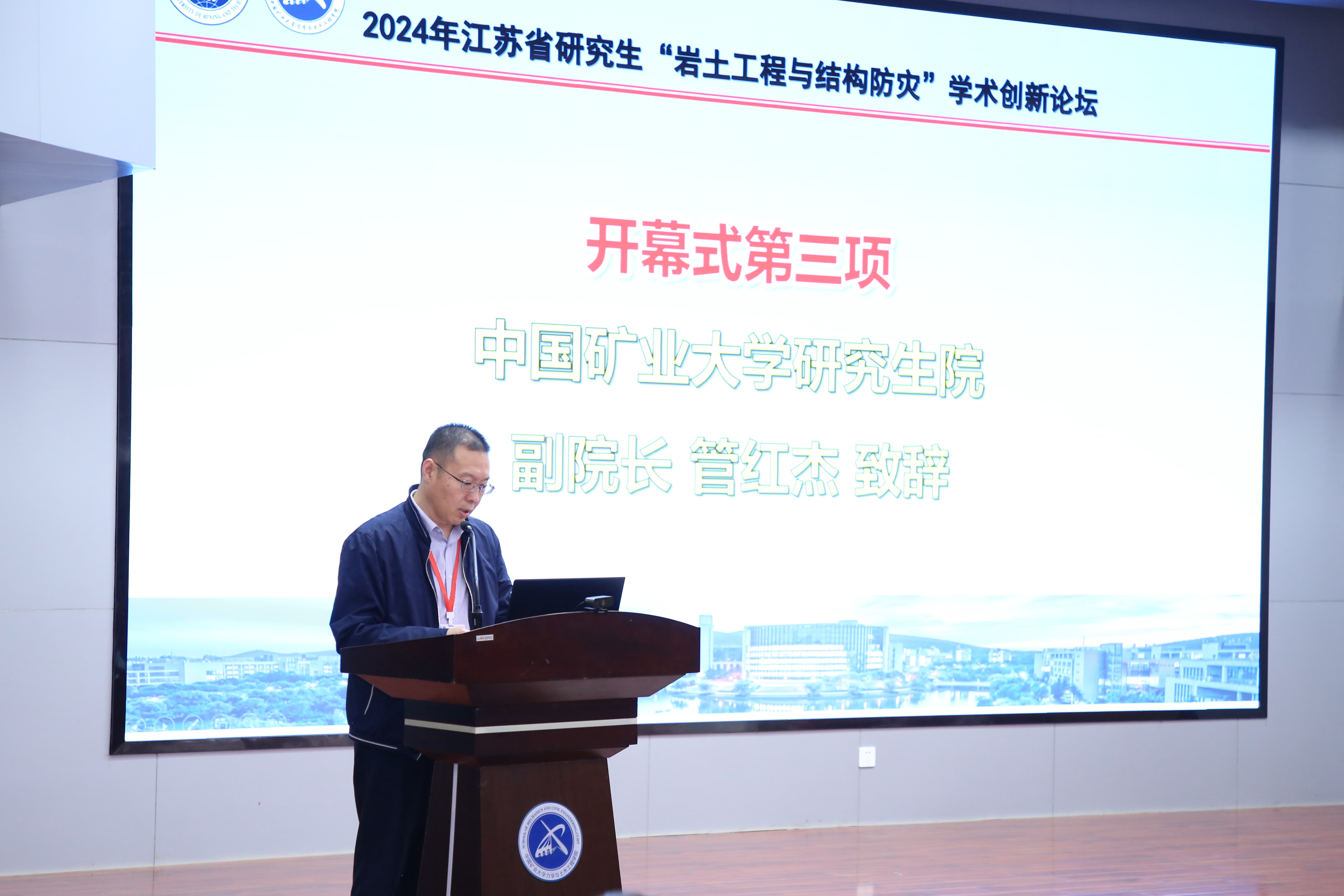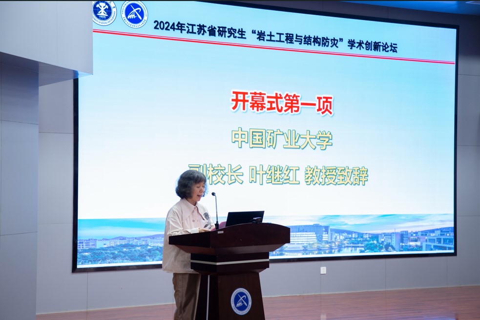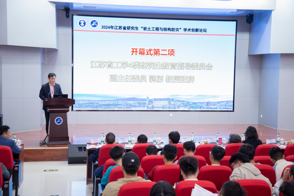 江苏省工学4类研究生教育指导委员会副主任委员郭彤代表主办单位致辞,向出席论坛的各位专家、学者和同学们表示热烈的欢迎,并简要介绍了江苏省研究生学术创新论坛的举办背景和意义。他讲到一直以来,矿大都十分重视研究生的学术交流和创新培养,为研究生的成长发展搭建了非常好的交流平台。本次论坛将围绕“地下空间精细化探测与识别”、“大跨硐室及硐室群智能建造”等议题展开交流研讨,将组织7个大会特邀报告和3场分组报告,各位学者和研究生同学将分别就各自研究领域的最新进展和学术思考进行交流发言,共同推动岩土工程与结构防灾研究的创新发展。