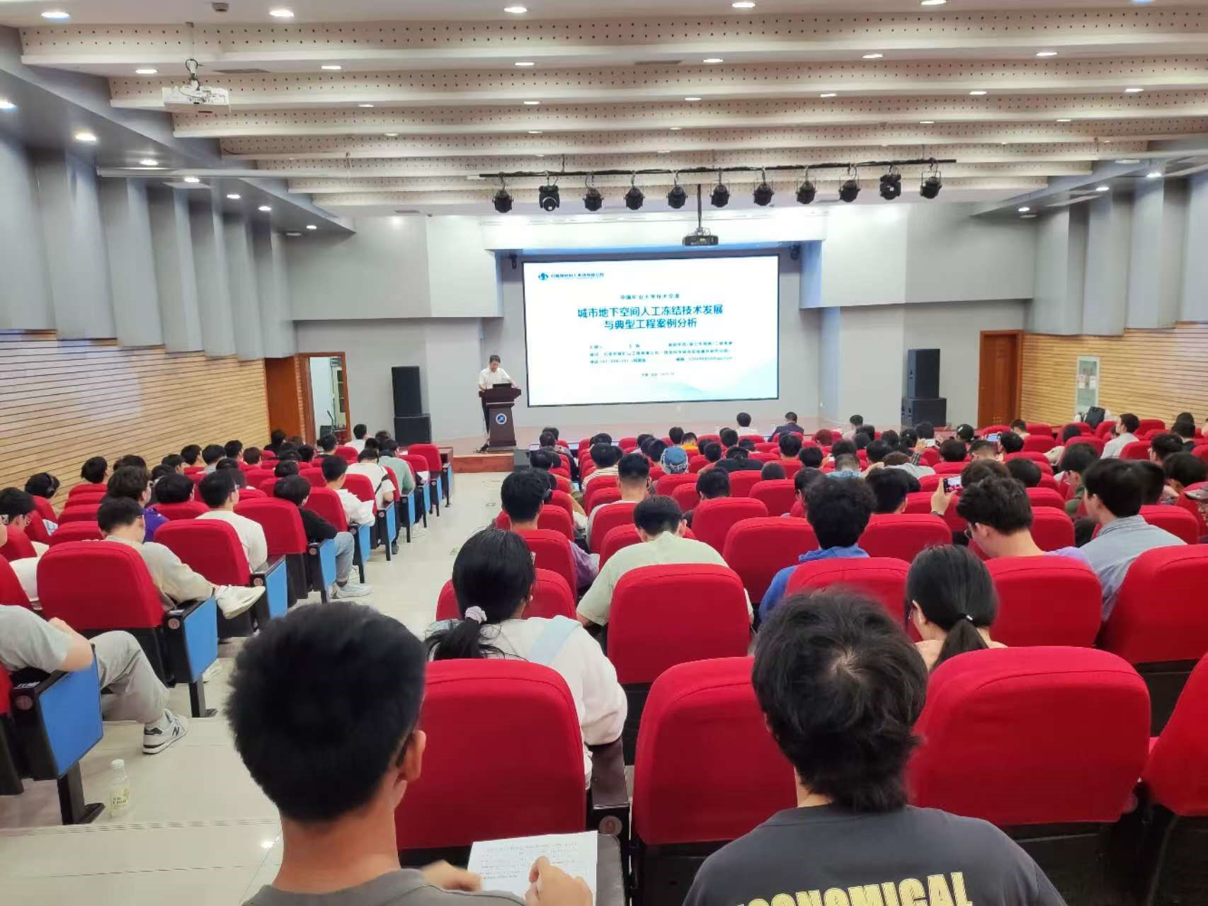A108报告厅,程守业首先向同学们介绍了煤炭科学研究总院建井研究分院的企业概况、人才引进政策、培养与成长情况。紧接着,王磊做了“城市地下空间人工冻结技术发展与典型工程案例分析”的学术报告,他结合多年的工作经验和研究成果,介绍了十余个典型的城市地下冻结工程案例,展示了人工冻结技术在解决复杂地质条件、保障施工安全、提高施工效率等方面的独特优势。学术报告会由王迎超主持,包括青年教师、本科生、研究生等约150余人参加了本次报告会。随后,郭鹏介绍了建井分院在研究生的招生、培养、就业等方面的相关政策。