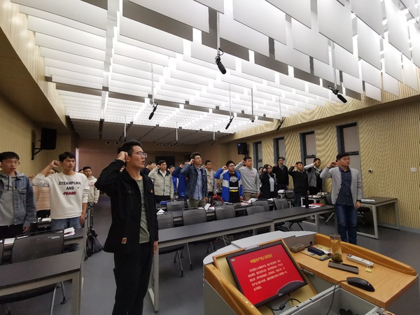 工程管理2016-1班韩飞虎同学带领全体党员重温入党誓词,全体党员面对着党旗庄严宣誓。