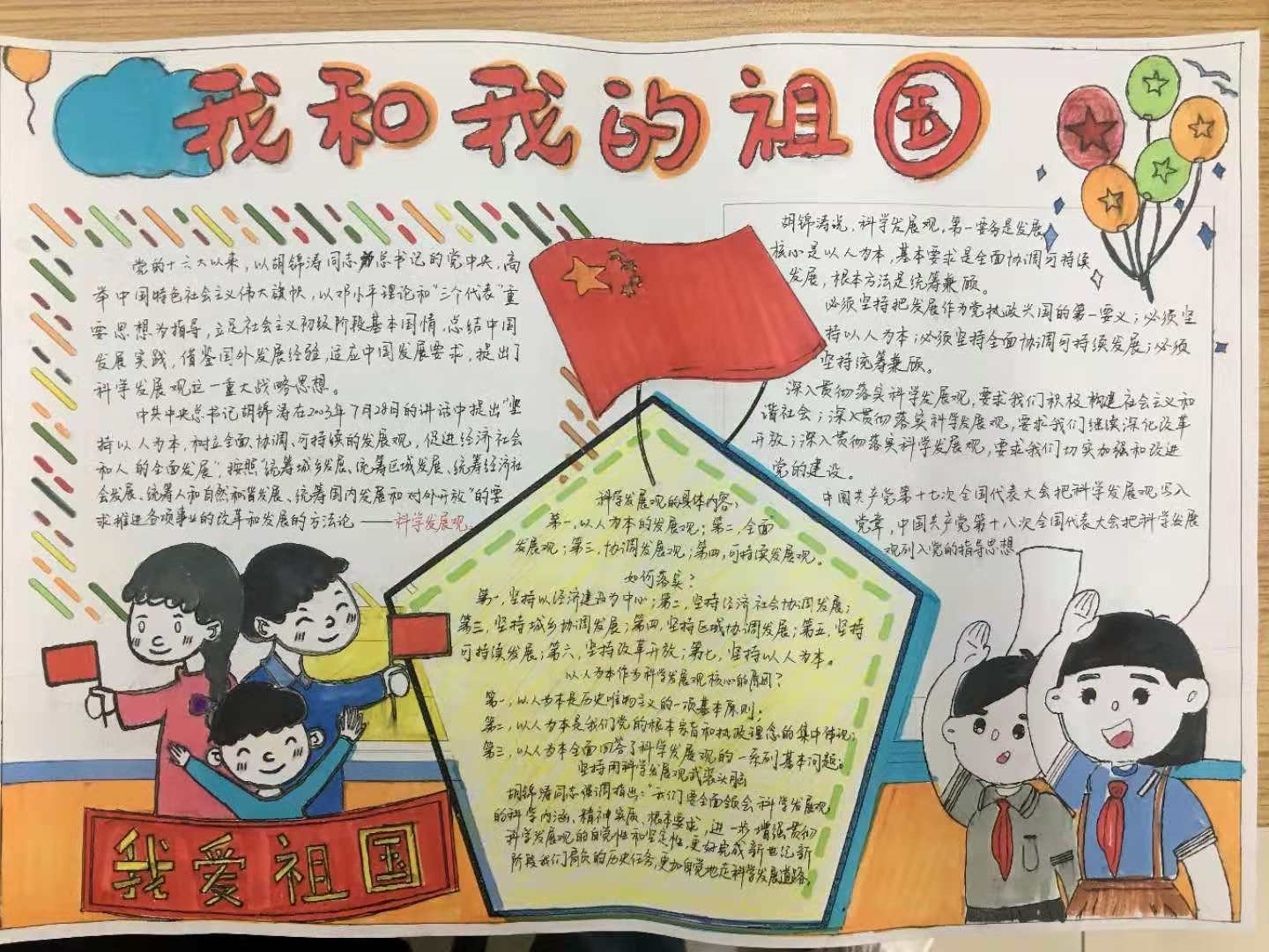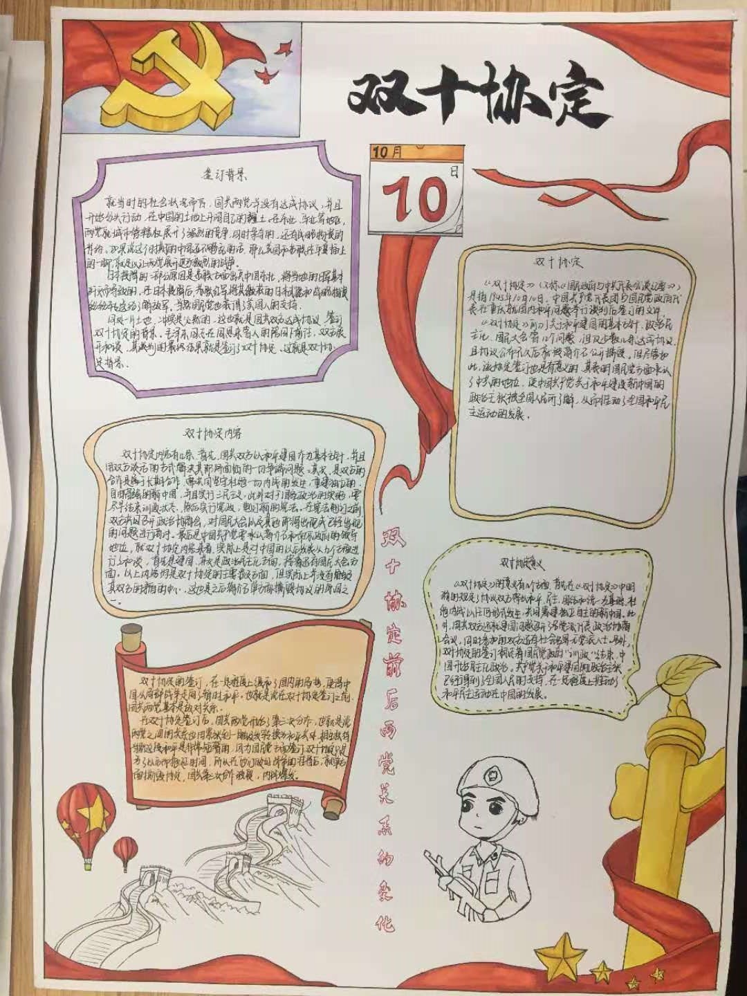 第58期入党积极分子培训班全体同学3-5人组成一个小组,以党的发展历程中的二十个大事件为主题,广泛搜集资料,开展小组讨论并绘制手抄报,在手抄报上体现队内每个人对建党大事件的理解与看法。同学们通过美术字、手绘图、艺术标语等形式,图文并茂,全方位、多角度地展示了党的奋斗历史和发展历程。
