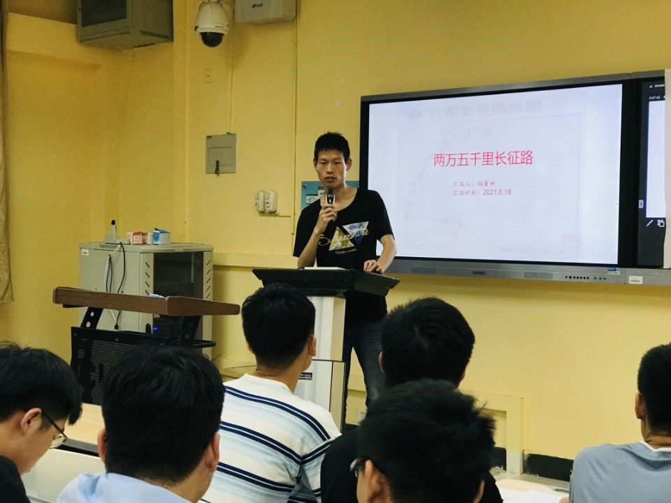 晚上7点,活动正式开始。支部副书记杨晨明首先向在场党员宣读了此次活动的目的和意义,接着讲述了主题为《红军二万五千里长征》的党课。杨晨明副书记结合红军长征过程中遇到的艰难险阻以及在危难之际党员同志奋不顾身的英雄事迹,赞扬了革命先烈大无畏、不怕牺牲、乐观的革命精神。虽时隔近百年,但是在场同志仍深深感受到触动和震撼。