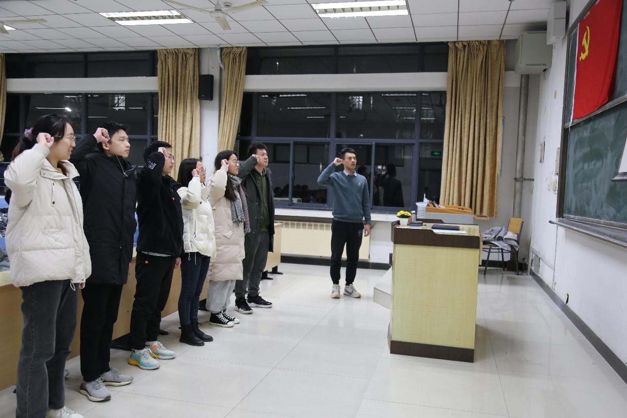 随后进行的预备党员接收大会上,10名发展对象同学对自身情况进行汇报,支部书记路铭代表支部委员会对10名同学的情况进行介绍。经过与会党员讨论、无记名投票后,同意这10名同学发展为预备党员。在支部书记路铭的带领下,新发展的10名预备党员面对党旗庄严宣誓,并表明今后会努力成为合格的党员,全心全意为人民服务。