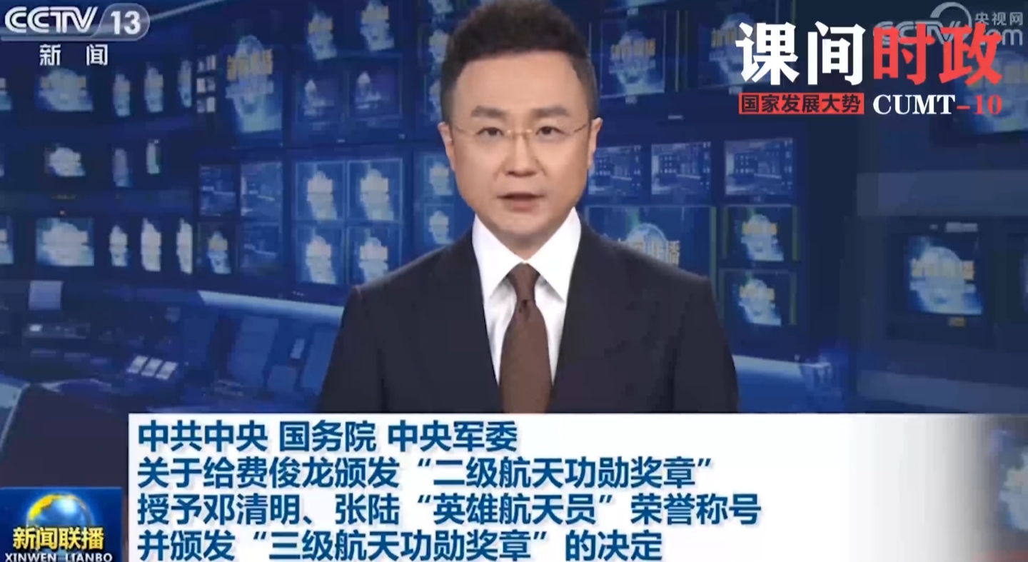 2.中共中央 国务院 中央军委关于给费俊龙颁发“二级航天功勋奖章” 授予邓清明、张陆“英雄航天员”荣誉称号并颁发“三级航天功勋奖章”的决定