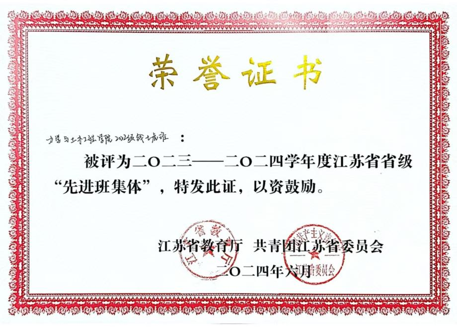 年度安全示范班集体,连续三次获评优良学风班、九次获得优良学风流动红旗,班级专业课成绩排名年级第一、英语四级通过率100%、奖学金获得率100%,班级成员获得江苏省大学生土木工程结构创新竞赛特等奖、中国国际大学生创新大赛江苏省一等奖等校级及以上科创竞赛奖项共40余项。