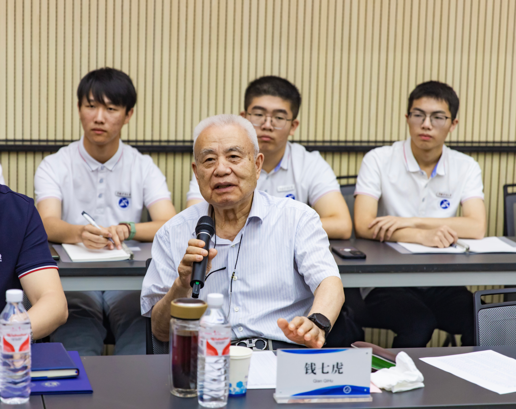 钱七虎班学生代表张浩翔、朱迅、赵健渝、益毕琛、张涵结合讲座报告内容或学习、生活中的困惑向钱七虎请教,钱七虎一一给出了细致的解答和建议。钱七虎寄语同学们,一是要身体好、学习好、工作好,这对于青年人特别重要;二是要把入党作为自己政治上的追求目标,树立全心全意为人民服务的意识;三是要牢记没有信息化就没有土木工程的现代化;四是要在大学阶段培养组织管理能力,增强交流表达能力。刘波向钱七虎致以崇高的敬意,希望钱七虎班同学们能做到钱七虎所说的政治上有追求,业务上有能力,特别是身体上要健康。同时,希望同学们牢记并践行自强不息、艰苦奋斗、追求卓越的校园精神,在内心种下立志成才,报效祖国的种子,努力成长为一名栋梁之才。