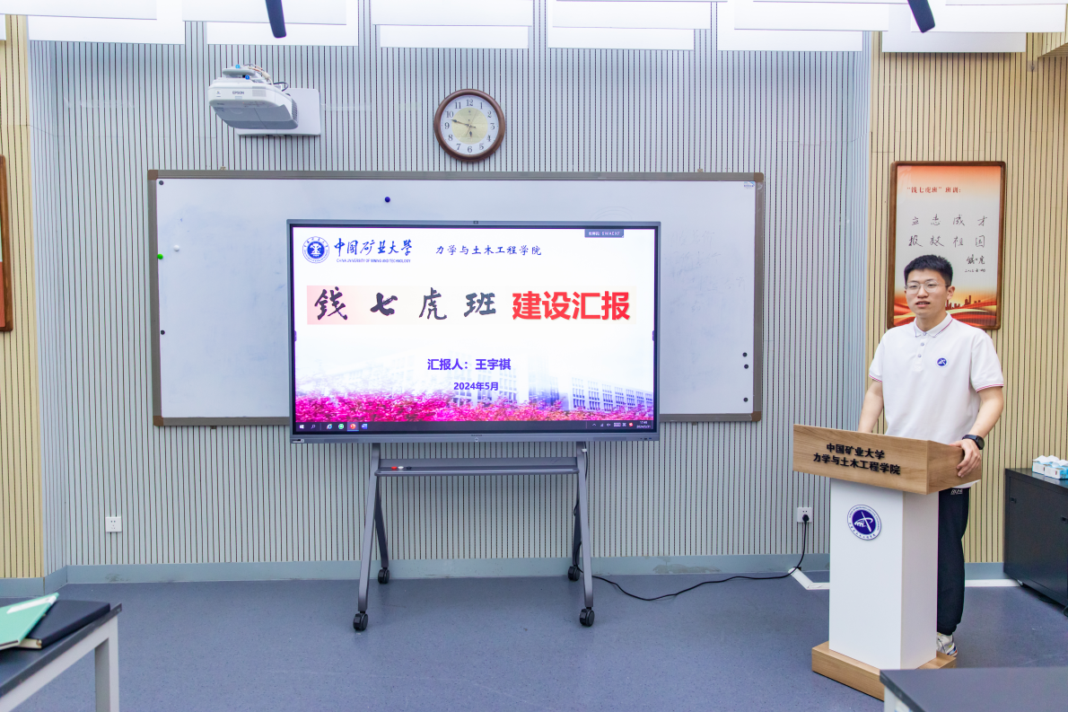 2022级钱七虎班班长王宇祺汇报班级情况。他介绍了钱七虎班人员组成、培养模式以及班级自成立以来,在思想引领、精神传承、社会实践,学风建设、学科竞赛等各方面取得的成绩,表示将牢记“立志成才、报效祖国”的班训,勇做走在时代前列的开拓者、奋进者、奉献者。